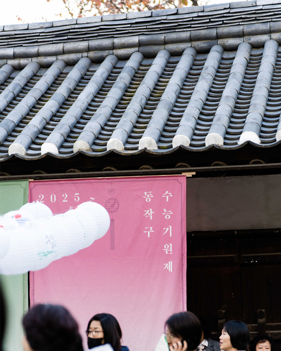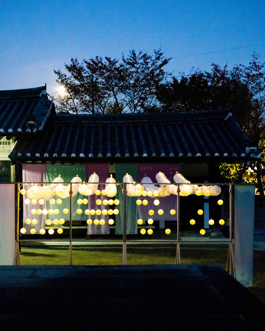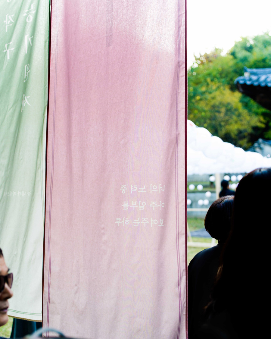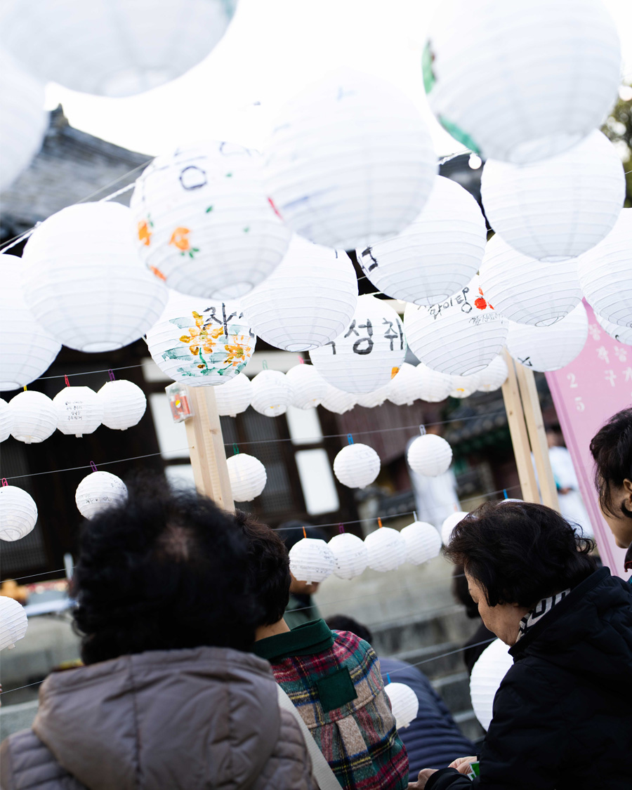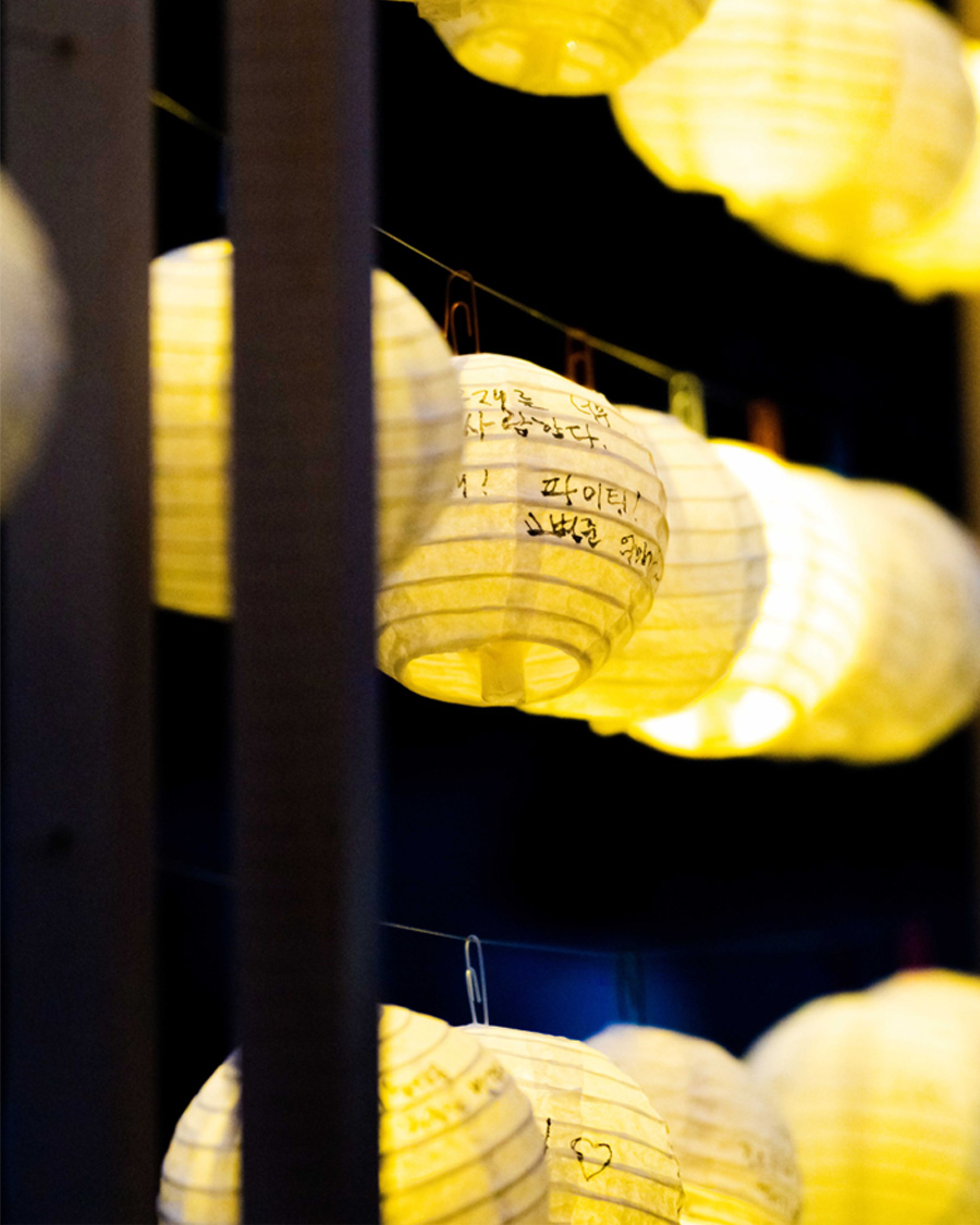 The space was composed with a restrained aesthetic, in harmony with the shrine’s inherent sense of calm and order. Soft pastel tones were used as subtle accents, and words of encouragement were placed throughout the space to gently convey support. White lanterns, carrying the wishes of parents, were used to allow their heartfelt hopes to appear in their purest form. As these lanterns gathered, they filled the space, creating a scene in which individual prayers came together as a collective presence. Some of the lanterns were adorned with handwritten messages and drawings by members of the Sadang 5-dong Calligraphy Club, adding warmth and a sense of communal encouragement.