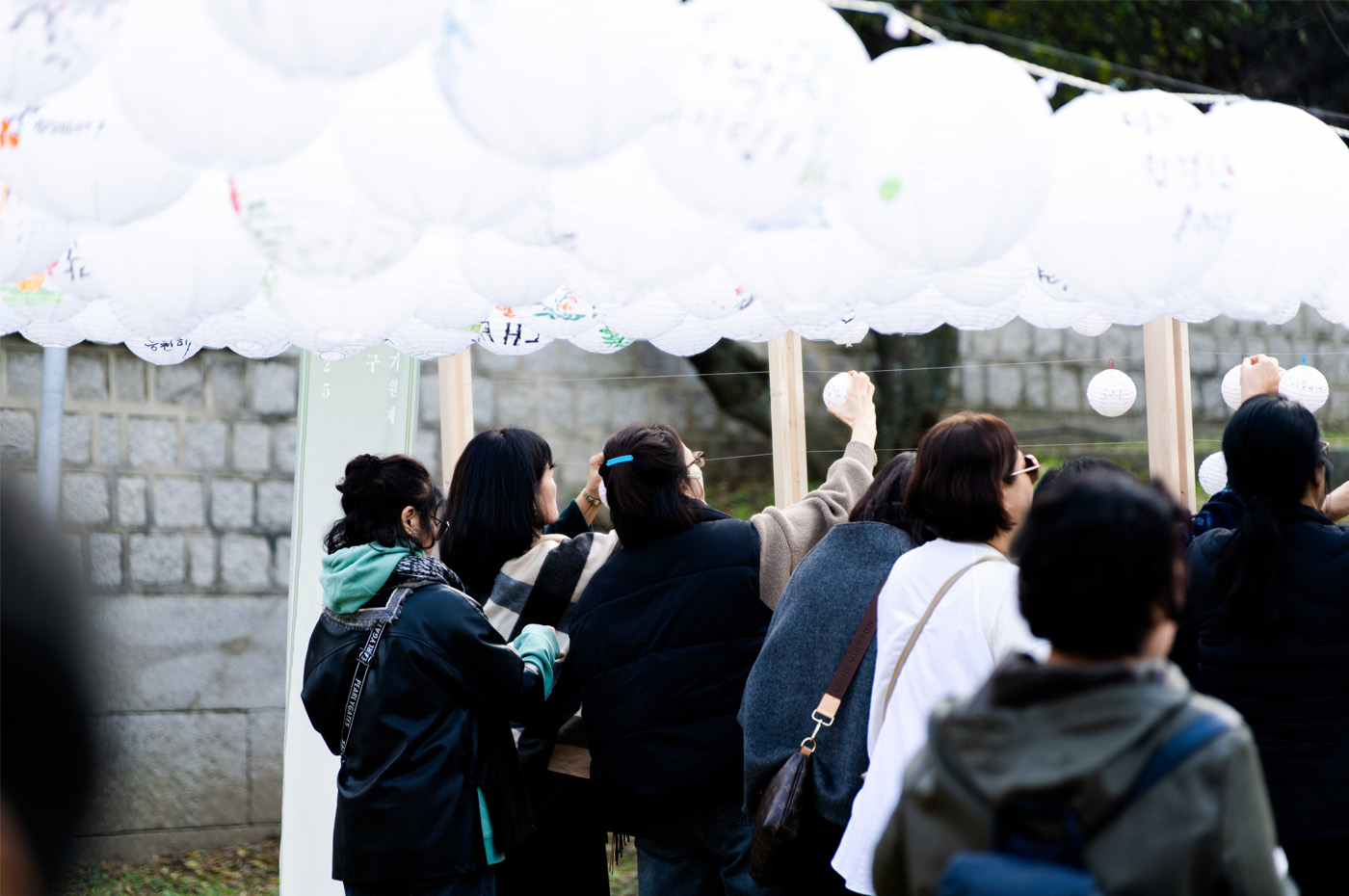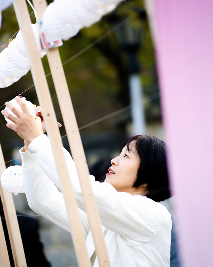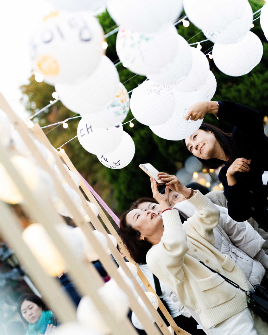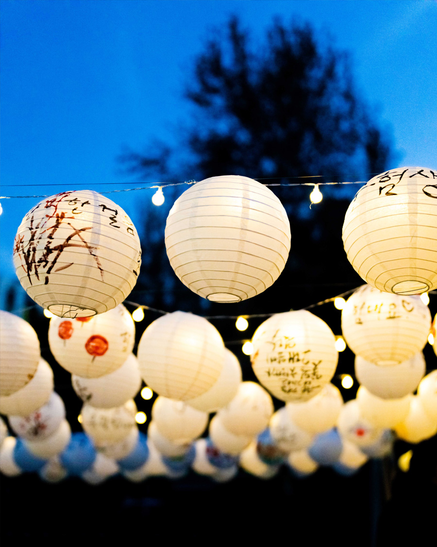 The space was composed with a restrained aesthetic, in harmony with the shrine’s inherent sense of calm and order. Soft pastel tones were used as subtle accents, and words of encouragement were placed throughout the space to gently convey support. White lanterns, carrying the wishes of parents, were used to allow their heartfelt hopes to appear in their purest form. As these lanterns gathered, they filled the space, creating a scene in which individual prayers came together as a collective presence. Some of the lanterns were adorned with handwritten messages and drawings by members of the Sadang 5-dong Calligraphy Club, adding warmth and a sense of communal encouragement.